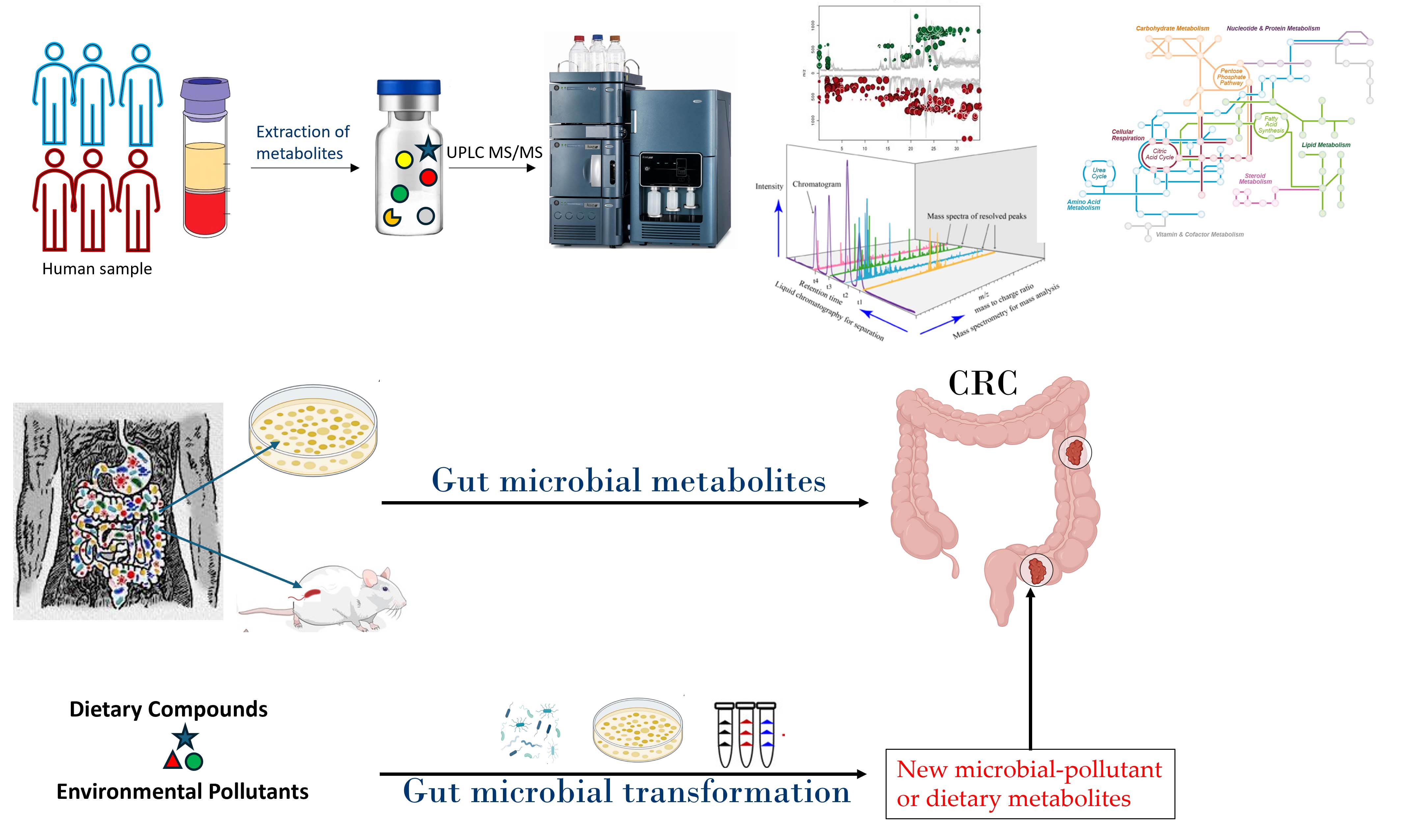 A major focus is understanding subsite-specific microbial–metabolite interactions in colorectal cancer and their links to liver metastasis and tumor heterogeneity. We also study how pollutant- and diet-driven metabolic variation in human populations contributes to cancer susceptibility, including risks in childhood cancer. Our group develops advanced metabolomics technologies and computational tools to identify novel conjugated metabolites and biomarker discovery. Ultimately, we aim to uncover microbial-metabolite signatures that enable early detection and guide microbiome-informed cancer prevention and therapy.