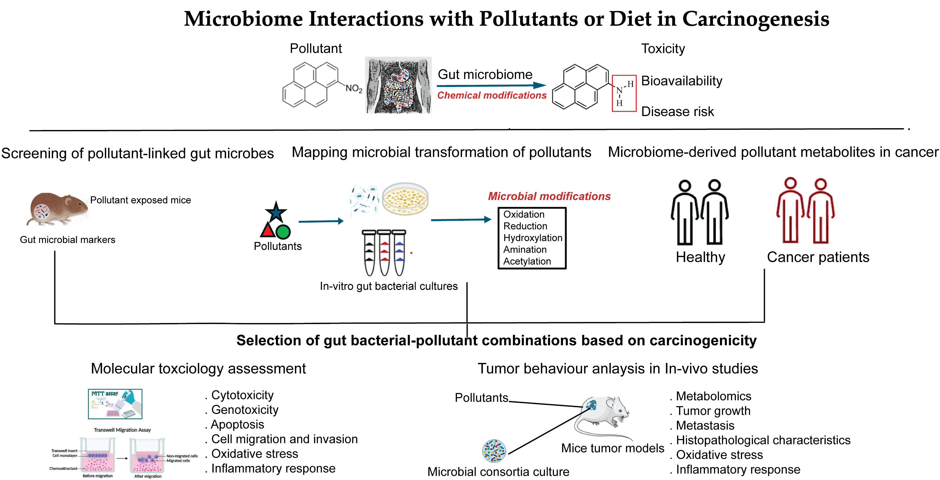Figure 1: Overview of the study design to investigate gut microbiome interactions with pollutants in carcinogenesis